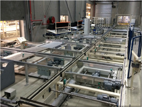 • 4 tables pivotantes 12 élévateurs/déviateurs • 52 tables bi-chaînes • 18 tables fixes • 2 transbordeurs à fourches (2m/sec.) avec gestion de l’anticollision en Safety (variateur SEW, codage triple)